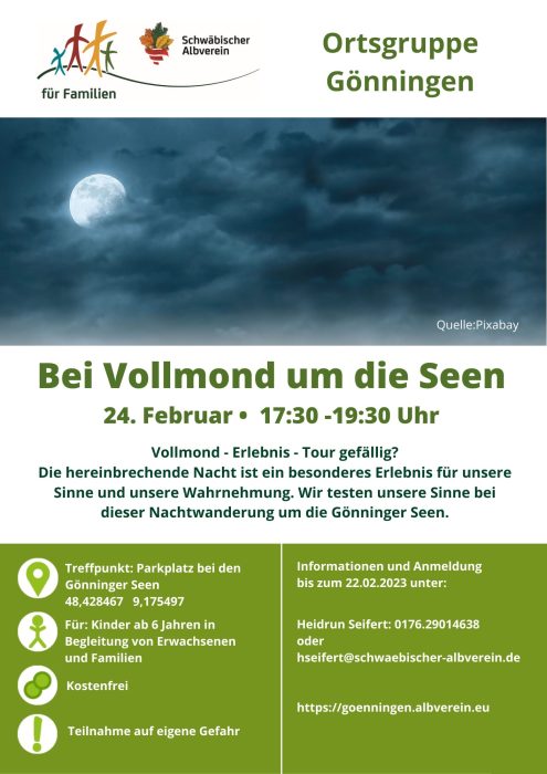 Bei Vollmond um die Seen – mit der Familiengruppe Gönningen Sa., 24.02.2024, Gönningen Uhrzeit: 17:30 - 19:30 Ort: Parkplatz Gönninger Seen Parkplatz Gönninger Seen 72770 Gönningen iCalendar Mit dem Laden der Karte akzeptieren Sie die Datenschutzerklärung von Google.Mehr erfahren Karte laden Google Maps immer entsperren zur Übersicht