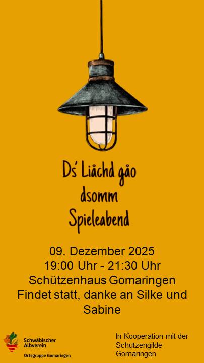 Ds Liachd gao Di., 09.12.2025, Gomaringen Uhrzeit: 19:00 Ort: Schützenhaus Auchtertgasse 72810 Gomaringen iCalendar Mit dem Laden der Karte akzeptieren Sie die Datenschutzerklärung von Google.Mehr erfahren Karte laden Google Maps immer entsperren zur Übersicht