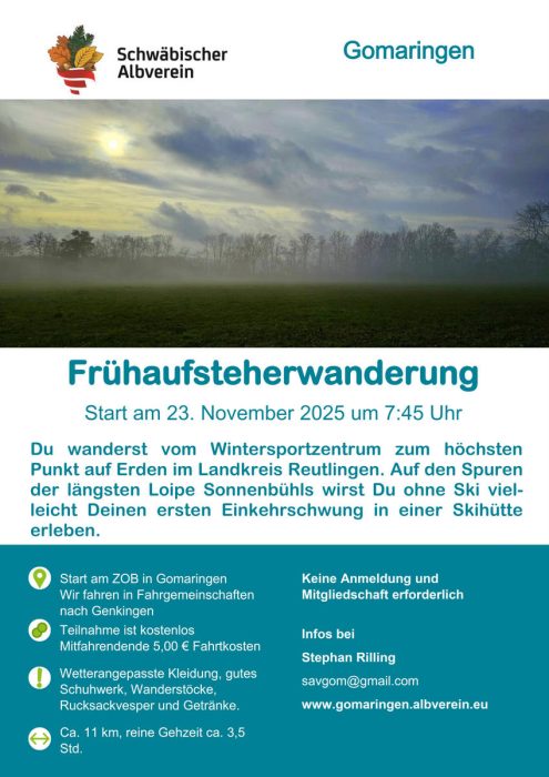 Frühaufsteherwanderung – Auf gut Glück über den Wolken So., 23.11.2025, Gomaringen Uhrzeit: 07:45 Ort: Rathausparkplatz beim ZOB ZOB 72810 Gomaringen iCalendar Mit dem Laden der Karte akzeptieren Sie die Datenschutzerklärung von Google.Mehr erfahren Karte laden Google Maps immer entsperren zur Übersicht