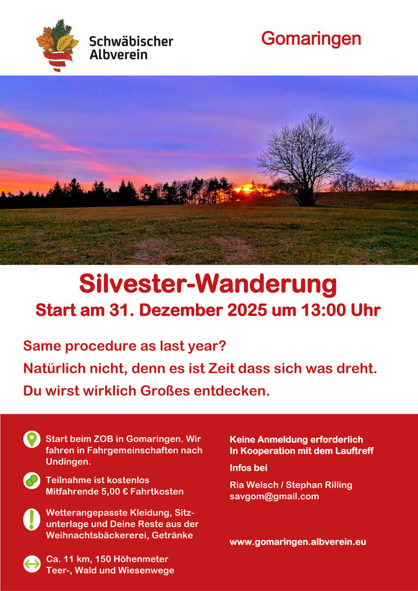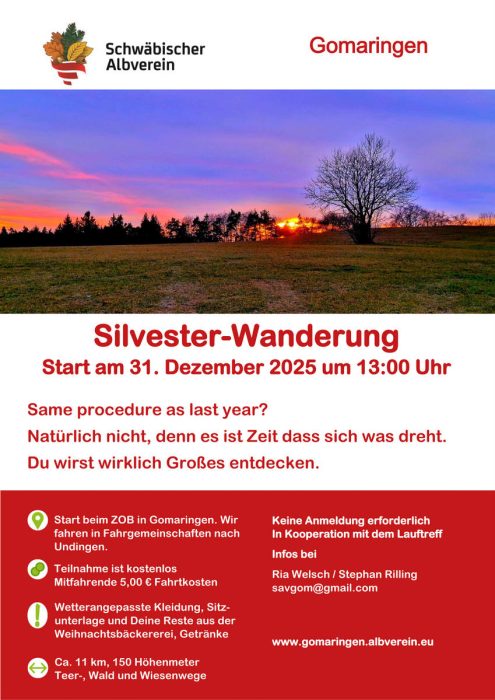 Silvesterwanderung mit dem Lauftreff Mi., 31.12.2025, Gomaringen Uhrzeit: 13:00 Ort: Sportpark Gomaringen Haydnstraße Gomaringen iCalendar Mit dem Laden der Karte akzeptieren Sie die Datenschutzerklärung von Google.Mehr erfahren Karte laden Google Maps immer entsperren zur Übersicht