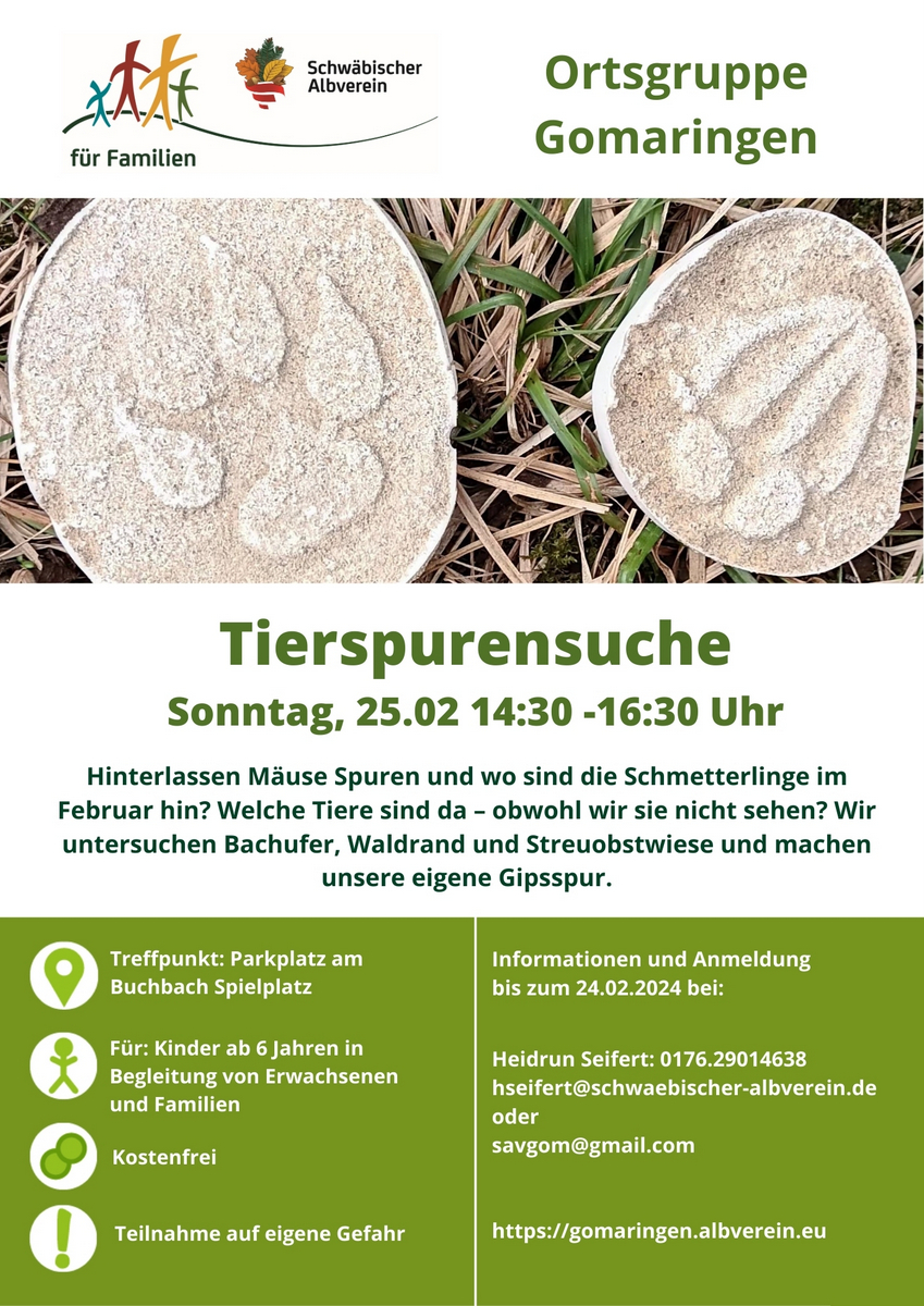 Tierspurensuche – Familienangebot So., 25.02.2024, Gomaringen Uhrzeit: 14:30 - 16:30 Ort: Buchbach Buchbach Gomaringen iCalendar Mit dem Laden der Karte akzeptieren Sie die Datenschutzerklärung von Google.Mehr erfahren Karte laden Google Maps immer entsperren zur Übersicht